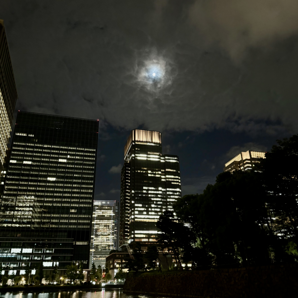 心もお腹も満たされて、ホテルを後に和田倉公園方面に歩き始めると、雲の合間からお月様🌕が顔を出してくれました!ほんの少しでも美しいお月様に感激した私です。